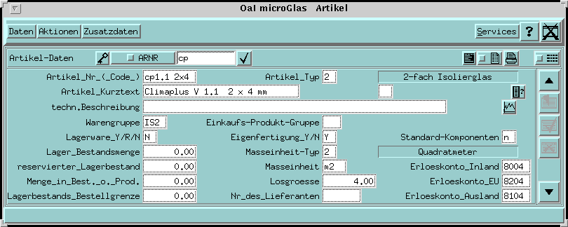 In einer primären Maske werden die Kerndaten des Artikels , hier eines Isolierglases cp1.1.2x4, dargestellt.