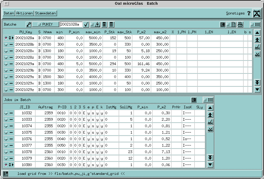 Im unteren Bereich sieht man die ersten in denm oben markierten Batch 20021028a eingelasteten Job's . Die Batchbenennung wird als Jahr - Monat - Tag - ID gebildet , wobei dieID beliebig gewählt sein kann und die verschiedenen Produktionsgruppen bezeichnen. Die markierte Zeile betrifft also den a-Batch des 28.10.2002.