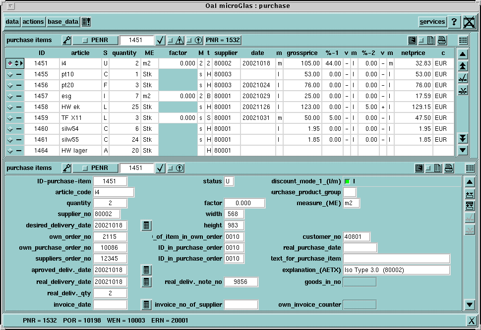 The upper part of this view showes a table of item to be purchased. In the lower part we have one of these purchase items with more details visible within a mask.