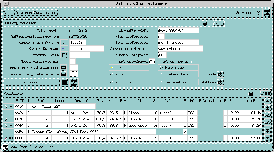Diese Darstellung zeigt die Erfassung des Auftrags 2372 mit einigen Isolierglaspositionen sowie je einer Kommissions- und einer Textzeile.