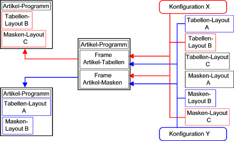 Dies soll an einem vereinfachten Fall erläutert werden. Nehmen wir z. B. das Artikel-Programm, so beinhaltet dieses u.A. zwei grundsätzlich verfügbare Frames, nämlich je einen für die Darstellung einer Maske und einer Tabelle.