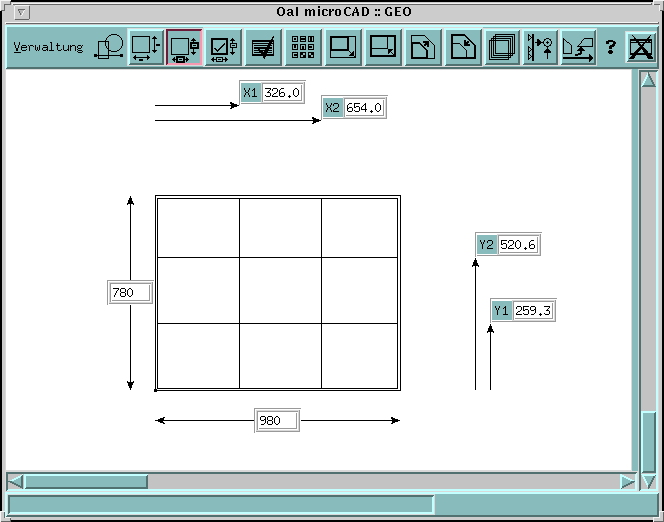 zunächst die symetrische Teilung und erzeugt dann die hier sichtbare Darstellung, wobei hier bereits Verschiebungen der Sprossenmitten vorgenommen wurde.