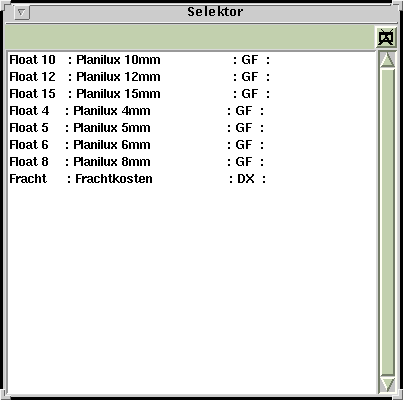 Im Beispiel wurde ein "F" vorgegeben, woraus die nachfolgend gezeigte Listbox entsteht (hier mehrere Float-Artikel etc.). Durch Doppelclick auf eine Listboxzeile wird dieser dann in der Maske zur Anzeige gebracht.