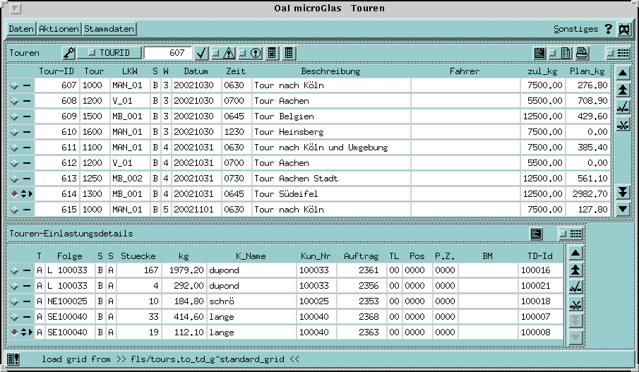 Im oberen Bereich dieser Darstellung sieht man eine Tabelle der vorgeplanten Touren (fortlaufende Tour-ID) mit den bereits eingelasteten Gewichten (Plan_kg). Im unteren Bereich sind die der markirten Tour 614 zugeordneten Aufträge sichtbar , welche typisch nach Kunden sortiert sind.